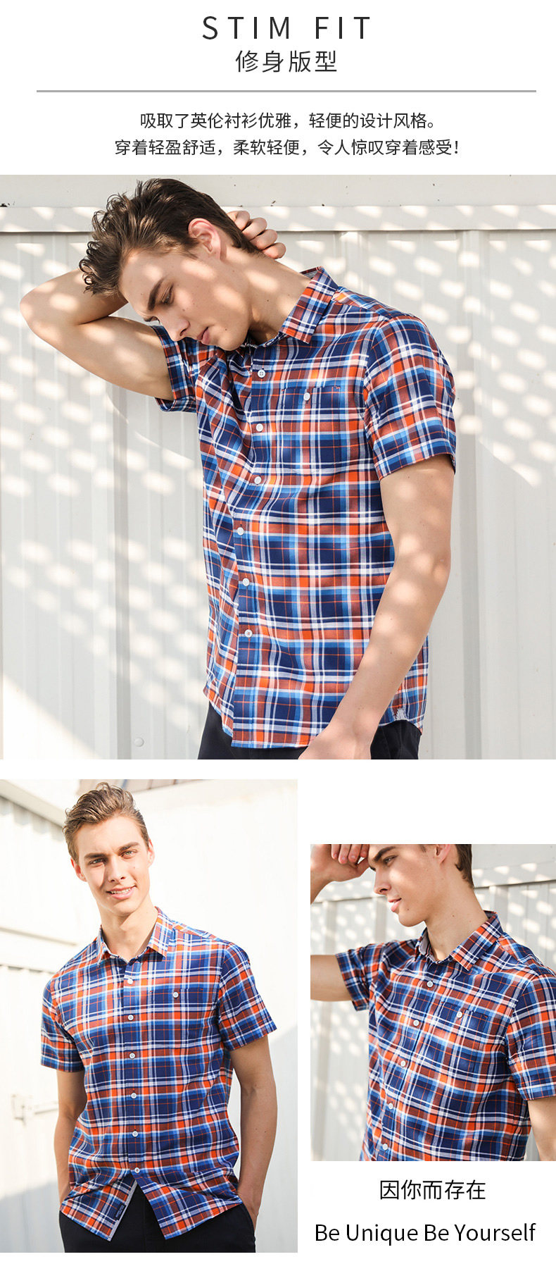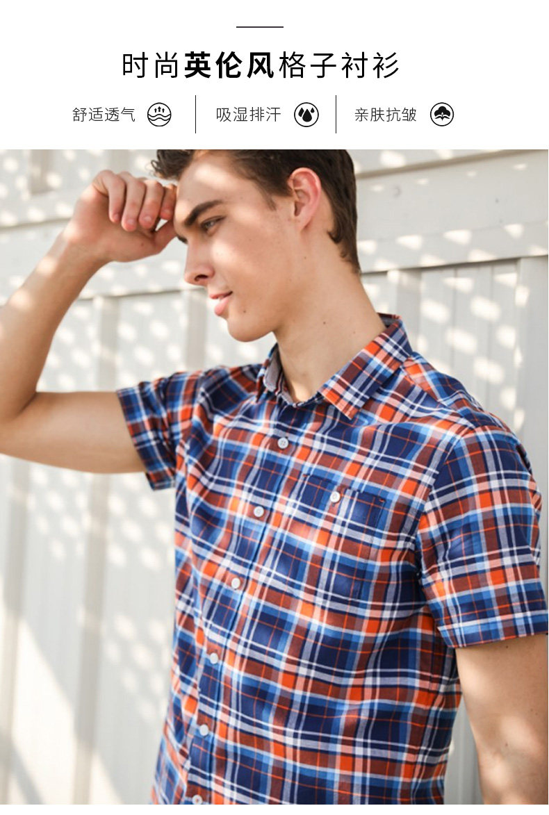波顿/Boton2018新款男款衬衫纯棉格子男衬衣英伦纯棉短袖衬衣夏