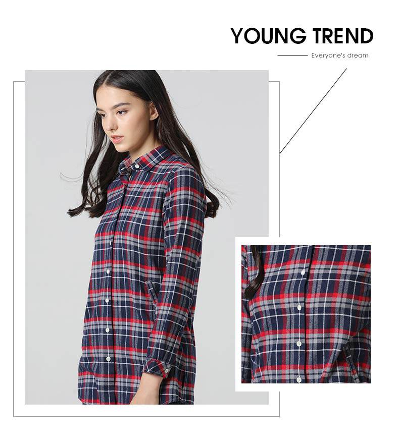 波顿/Boton2018年新款秋季中长款红蓝白格子衬衫磨毛女士修身衬衣