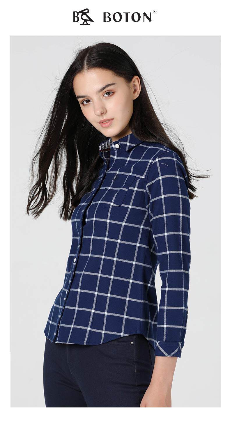 波顿/Boton2018年新款女士秋冬季纯棉磨毛格子长袖衬衫英伦